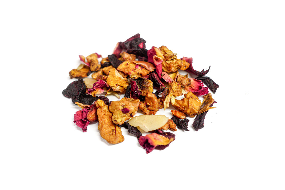 Sastāvdaļas: Āboli, hibisks, MANDEĻU skaidiņas, aromātviela, kardamona sēkliņas, biešu gabaliņi, rožlapiņas, ķiršu pusītes, granātābola sēkliņas.