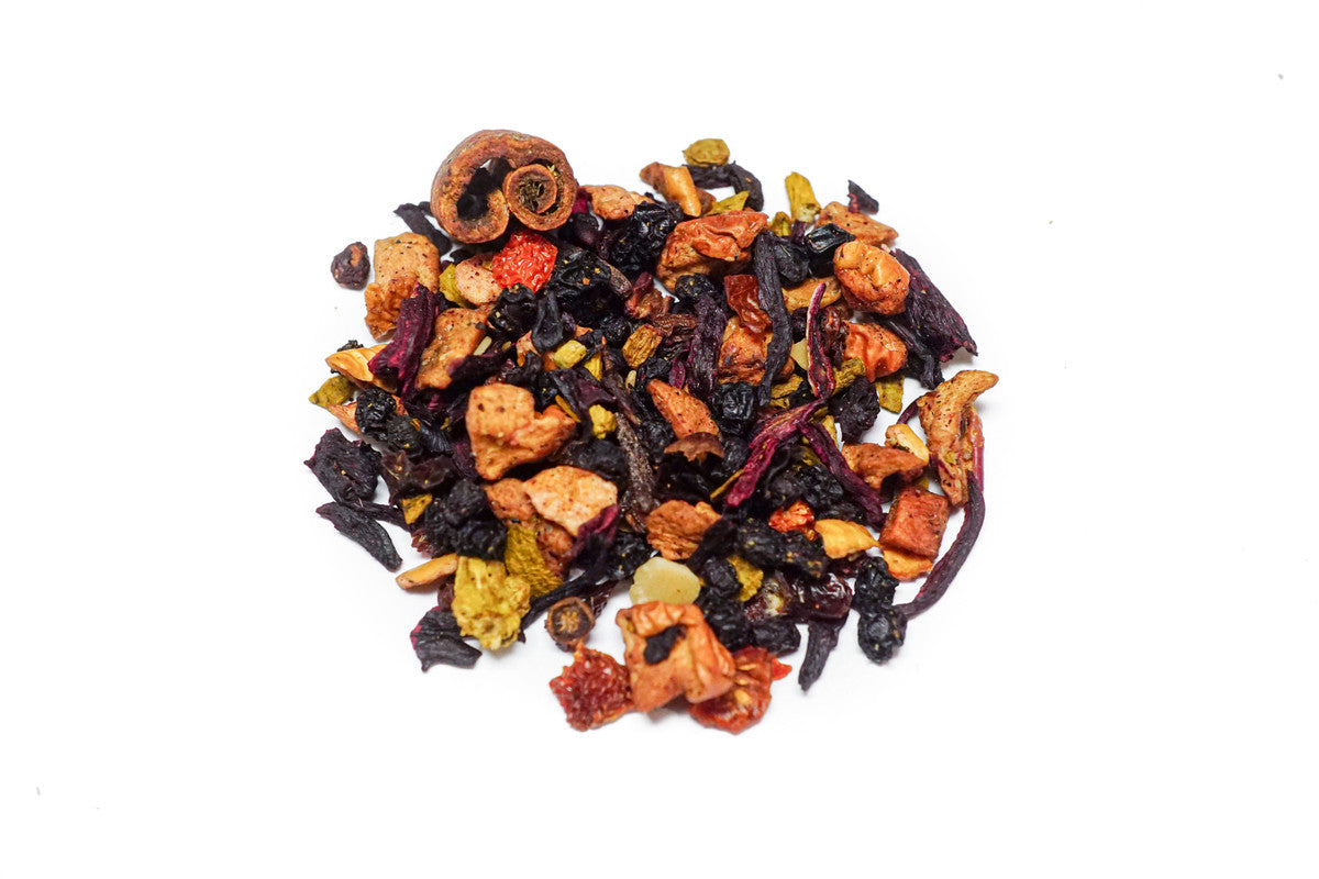 Sastāvdaļas: ābolu gabaliņi, hibiska ziedi, plūškoka ogas, mežrozīšu miza, ābolu šķēles, āmuļi, kanēļa stienīši, sagrieztas mandeles, aromatizētājs, krustnagliņas.