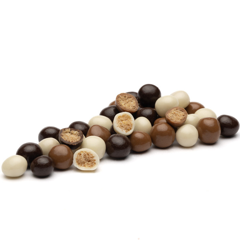 Tie ir kukurūzas kraukšķi ar baltu, karameles glazūru un tumšo šokolādi. Šīs trīs garšu un krāsu kukurūzu bumbiņas ir ļoti iecienītas mazo saldummīļu vidū.