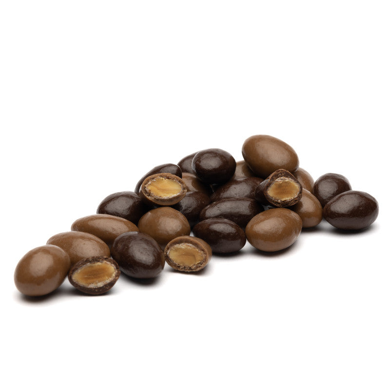 Kraukšķīgas mandeles, pārklātas ar tumšo šokolādi un karameles glazūru, papildinātas ar kafiju. Divas lieliskas garšas vienā baudījumā!