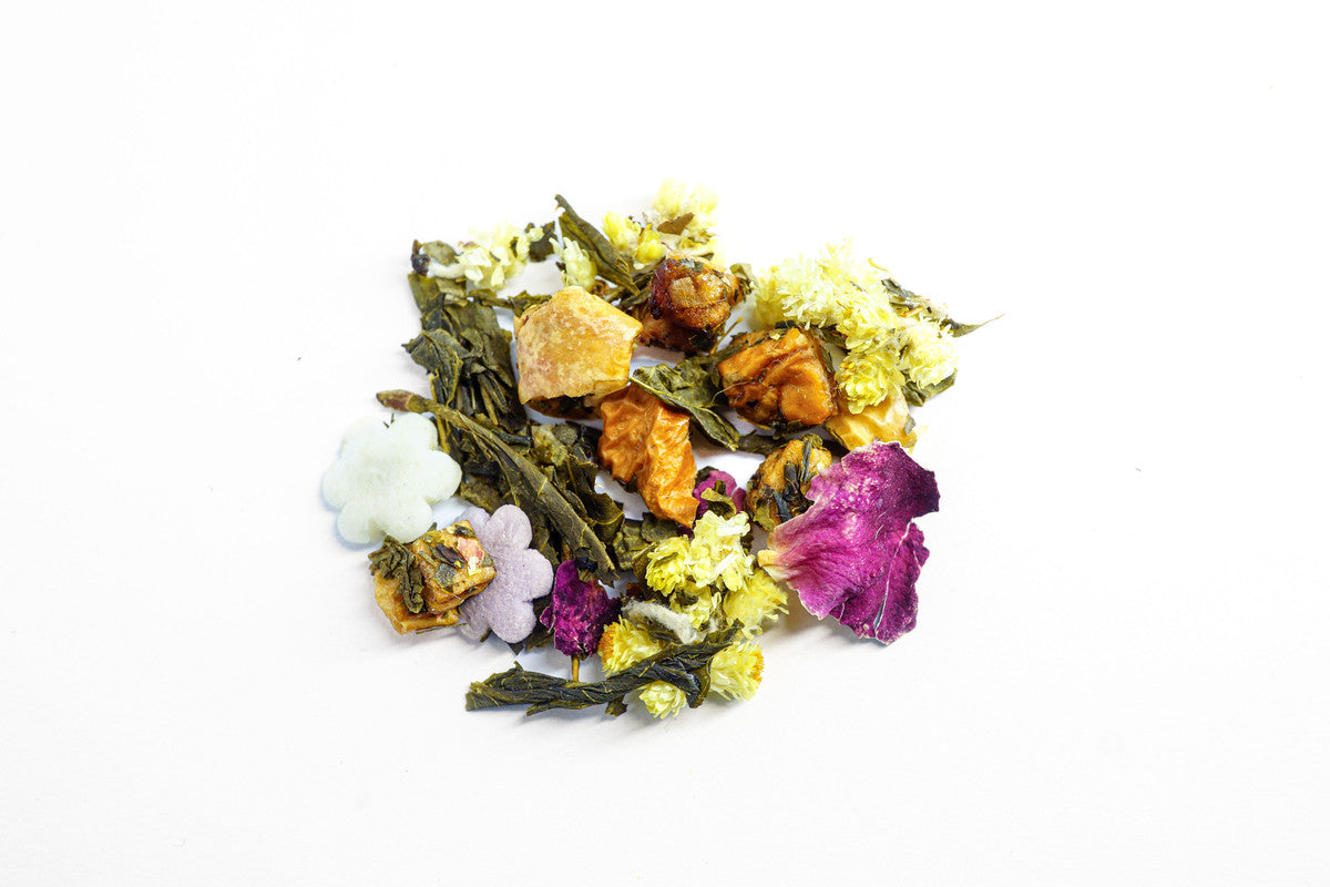Sastāvdaļas: zaļā tēja (51%), ābolu un persiku gabaliņi, aromātviela, cukura puķītes, lifiolizēti persiku gabaliņi, Manukas MEDUS pulveris, rožlapiņas, kaķpēdiņa.