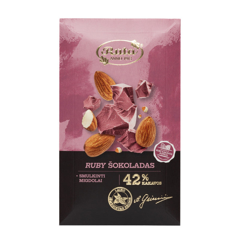 Ruby šokolāde ar sasmalcinātām mandelēm – augļu svaiguma, maiga skābuma un patīkama riekstu kraukšķīguma apvienojums. Ruby šokolāde ir unikāla ar to, ka tās krāsa un ogu garša iegūta dabīgi, neizmantojot krāsvielas vai garšas piedevas. Ruby šokolādes ražošanai izmanto violetas krāsas kakao pupiņas un īpašu to apstrādes metodi, kas saglabā krāsu un izceļ garšu. Šokolādes nosaukums Ruby (rubīns) radies no tās maigi rozīgās krāsas.