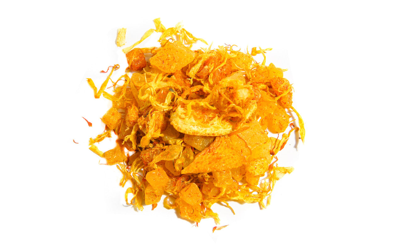 Sastāvdaļas: ananasi*, mango*, apelsīnu miziņas, safloras ziedi, apelsīni, kliņģerīšu ziedi, zemenes, aromātviela. Satur cukurniedru cukuru un skābinātāju: citronskābi.*