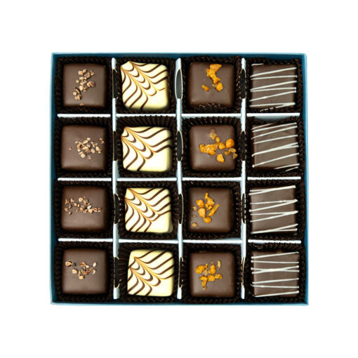 Eleganta izskata kastītē, kas dekorēta ar zelta krāsas elementiem un greznu lentīti, atradīsiet 16 šokolādes konfektes. Kopumā izlasē – 4 veidu konfektes. Kastīti rotā svētku kartīte ar siltu vēlējumu – „Sapņu piepildījumu!“.