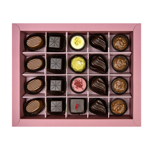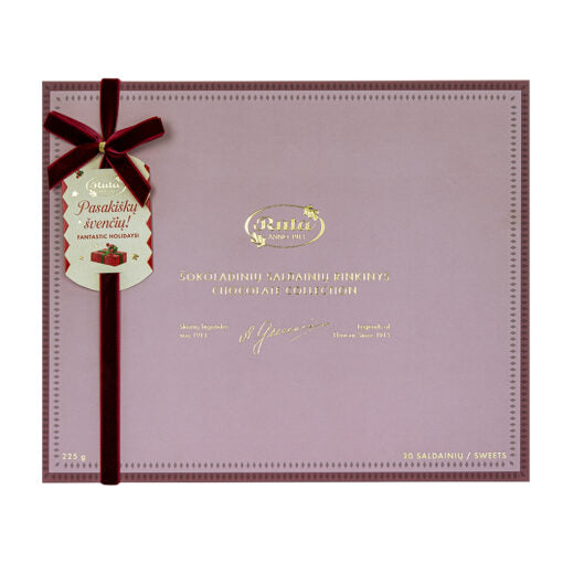 Eleganta izskata kastītē, kas dekorēta ar zelta krāsas elementiem un greznu lentīti, atradīsiet 20 šokolādes konfektes. Kopumā izlasē – 8 veidu konfektes. Kastīti rotā svētku kartīte ar sirsnīgu vēlējumu – „Pasakainus svētkus!“.