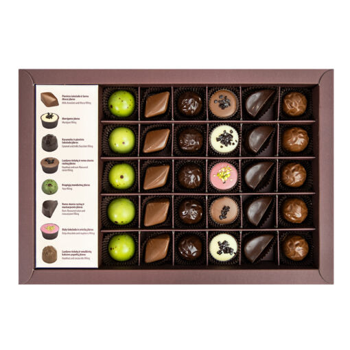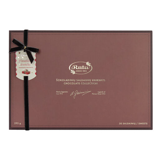 Eleganta izskata kastītē, kas dekorēta ar zelta krāsas elementiem un greznu lentīti, atradīsiet 30 šokolādes konfektes. Kopumā izlasē – 8 veidu konfektes. Kastīti rotā svētku kartīte ar sirsnīgu vēlējumu – „Pasakainus svētkus!“.