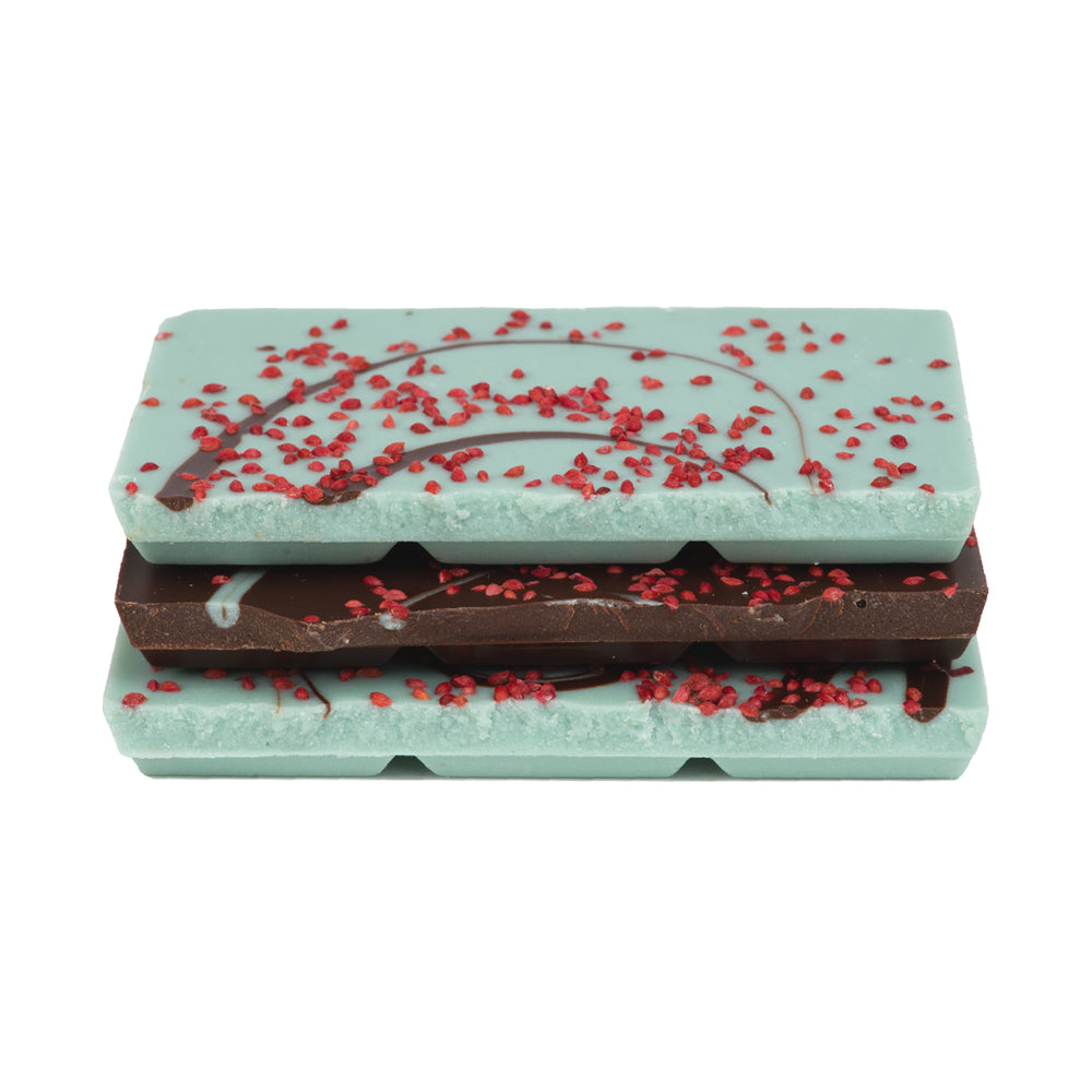 Sastāvdaļas: baltā piparmētru garšas šokolāde (baltā šokolāde (cukurs, kakao sviests, PILNPIENA pulveris, emulgators SOJAS lecitīns, vaniļas ekstrakts), kakao sviests, krāsviela spirulīnas ekstrakts, piparmētru eļļa), šokolāde (kakao masa, cukurs, kakao sviests, emulgatori (SOJAS lecitīns, poliglicerīna poliricinoleāts)), dzērveņu sēklas (2 %). DAUDZ ŠĶIEDRVIELU. Šokolādē kakao sausnas vielu – ne mazāk kā 75 %.