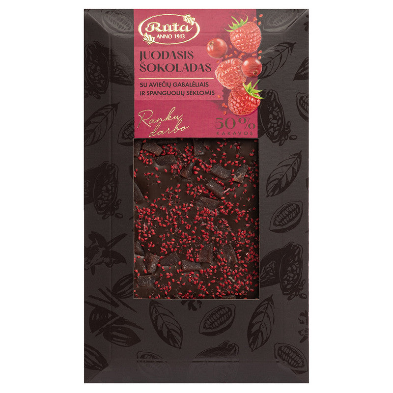 Sastāvdaļas: šokolāde (cukurs, kakao masa, kakao sviests, emulgatori (SOJAS lecitīns, poliglicerīna poliricinoleāts), aromātviela vanilīns), avenes gabaliņi 12 % (ābolu, aveņu biezenis, jāņogu sulas, fruktozes-glikozes sīrups, glikozes sīrups, cukurs, KVIEŠU šķiedrvielas, augu tauki (palmu), biezinātājs pektīns, skābumu regulējošas vielas (ābolu un citronu skābe), dabiskā aromātviela), dzērveņu sēklas (0,5 %). DAUDZ ŠĶIEDRVIELU. Šokolādē kakao sausnas vielu – ne mazāk kā 50 %.