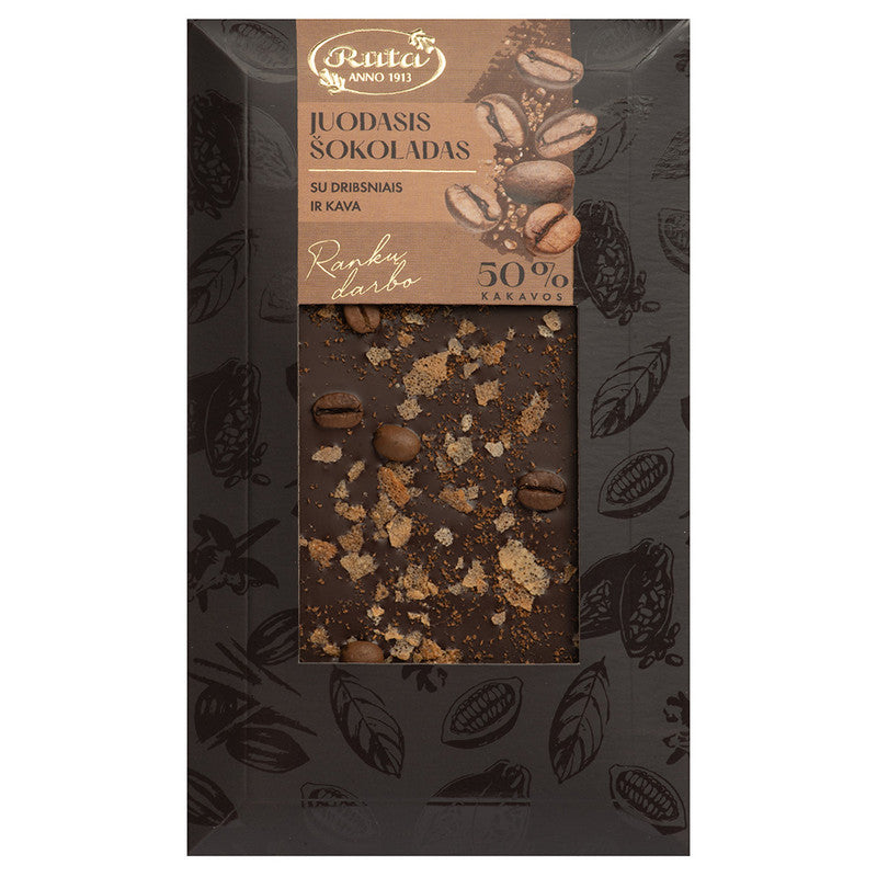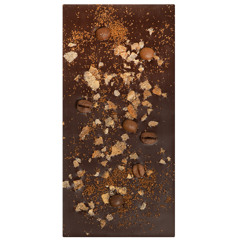 Sastāvdaļas: šokolāde (cukurs, kakao masa, kakao sviests, emulgatori (SOJAS lecitīns, poliglicerīna poliricinoleāts), aromātviela vanilīns), drupatas 2,0 % (KVIEŠU milti, cukurs, augu tauki (rapšu), PIENA tauki, PIENA cukurs, PIENA olbaltumvielas, sāls, iesala ekstrakts (MIEŽU), emulgators lecitīns, mīklas raušanas viela nātrija karbonāts), kafija (2,1 %). DAUDZ ŠĶIEDRVIELU. Šokolādē kakao sausnas vielu – ne mazāk kā 50 %.