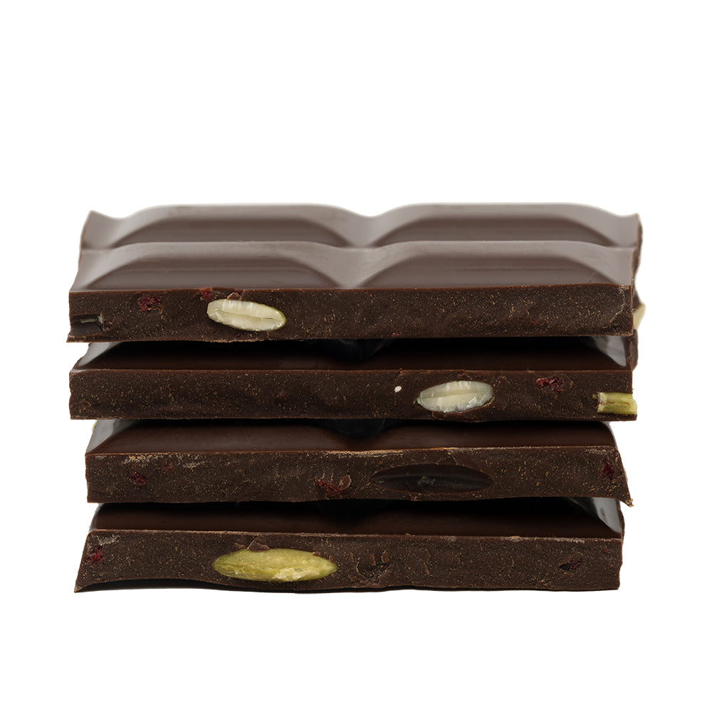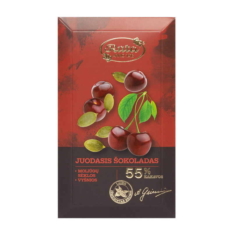 Sastāvdaļas: šokolāde (kakao masa, cukurs, kakao sviests, emulgators SOJAS lecitīns, dabīgā vaniļas aromātviela), ķirbju sēklas 7,6 %, ķiršu granulas 3,1 % (glikozes sīrups, ķirši 35 %, ciete, cukurs). Šokolādē kakao sausnas vielu – ne mazāk kā 55 %. DAUDZ ŠĶIEDRVIELU.