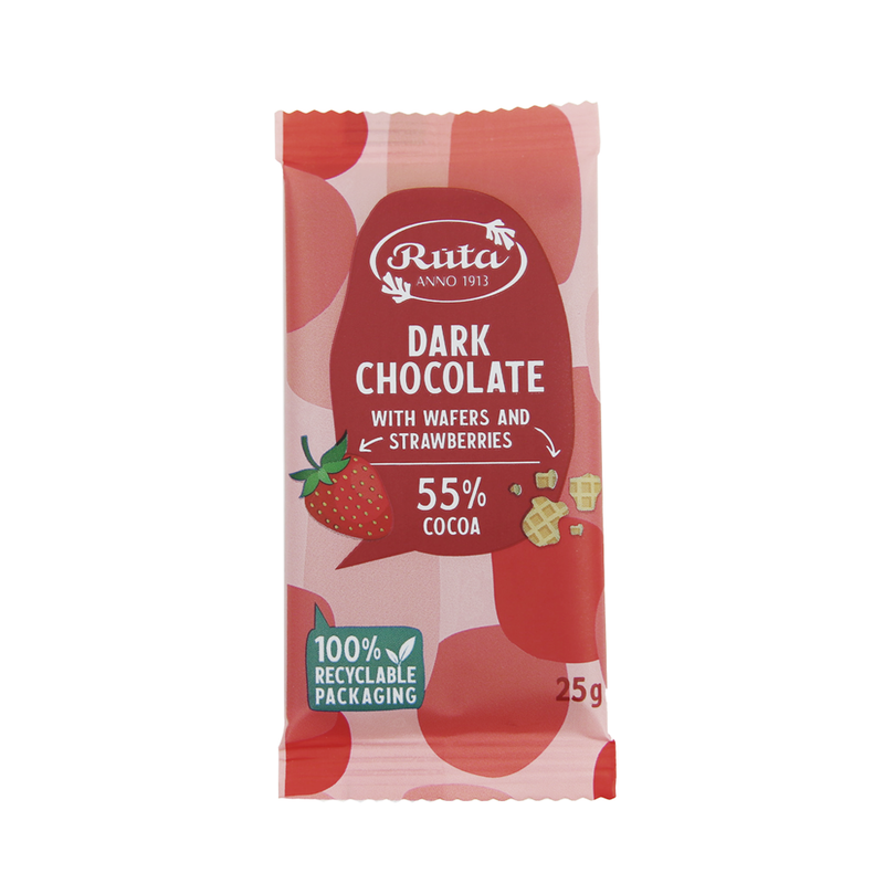 Sastāvdaļas: šokolāde (kakao masa, cukurs, kakao sviests, emulgator SOJAS lecitīns, dabīgs vaniļas aromatizētājs), vafeles 2% (KVIEŠU milti, cukurs, kokosriekstu tauki, emulgators (saulespuķu lecitīns), karamelizēts cukura sīrups, sāls), zemeņu granulas 2% (glikozes sīrups, zemenes 35%, cukurs, tapiokias ciete). Daudz šķiedrvielu. Kakao saturs šokolādē – vismaz 55%.