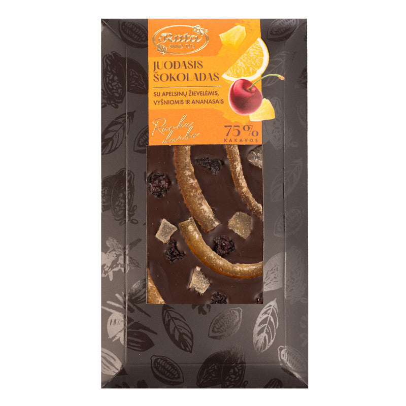 Sastāvdaļas: šokolāde (kakao masa, cukurs, kakao sviests, emulgatori (SOJAS lecitīns, poliglicerīna poliricinoleāts)), apelsīna miziņas 10 % (apelsīna miziņas, glikozes-fruktozes sīrups, cukurs), kaltēti ķirši 9 % (ķirši (74,5 %), cukurs, augu eļļa (saulespuķu)), cukuroti ananāsi 7 % (ananāsi (51,3 %), cukurs (48 %), skābi regulējošā viela citronskābe, konservants SĒRA DIOKSĪDS). DAUDZ ŠĶIEDRVIELU. Šokolādē kakao sausnas vielu – ne mazāk kā 75 %.