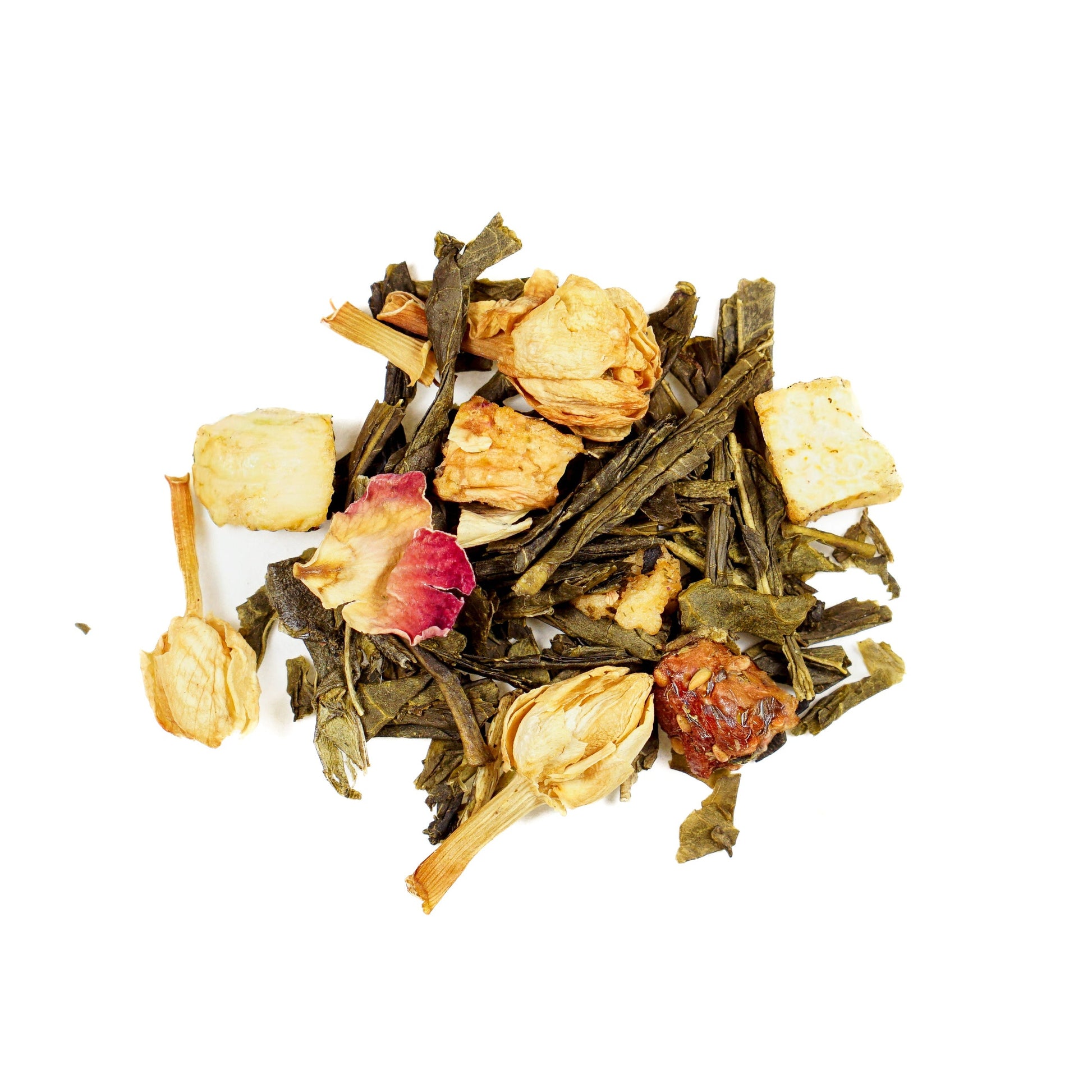 Sastāvdaļas: zaļā tēja (94%), liofilizēti zemeņu gabaliņi, liofilizēti līčes gabaliņi, jasmīnu ziedi, rožu ziedlapiņas,aromātviela.