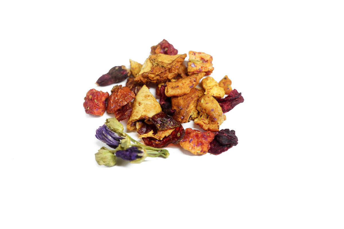 Sastāvdaļas: abolu gabaliņi, hibisks, mežrozīšu augļi, malvas ziedi, zemenes (5%), rabarberi (3%), aromātviela.