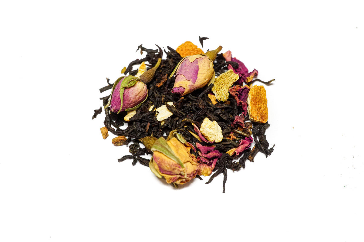 Sastāvdaļas: melnā tēja, kanēlis, apelsīnu miziņas, krustnagliņas, rožu ziedlapiņas, rožu pumpuri, aromātviela.