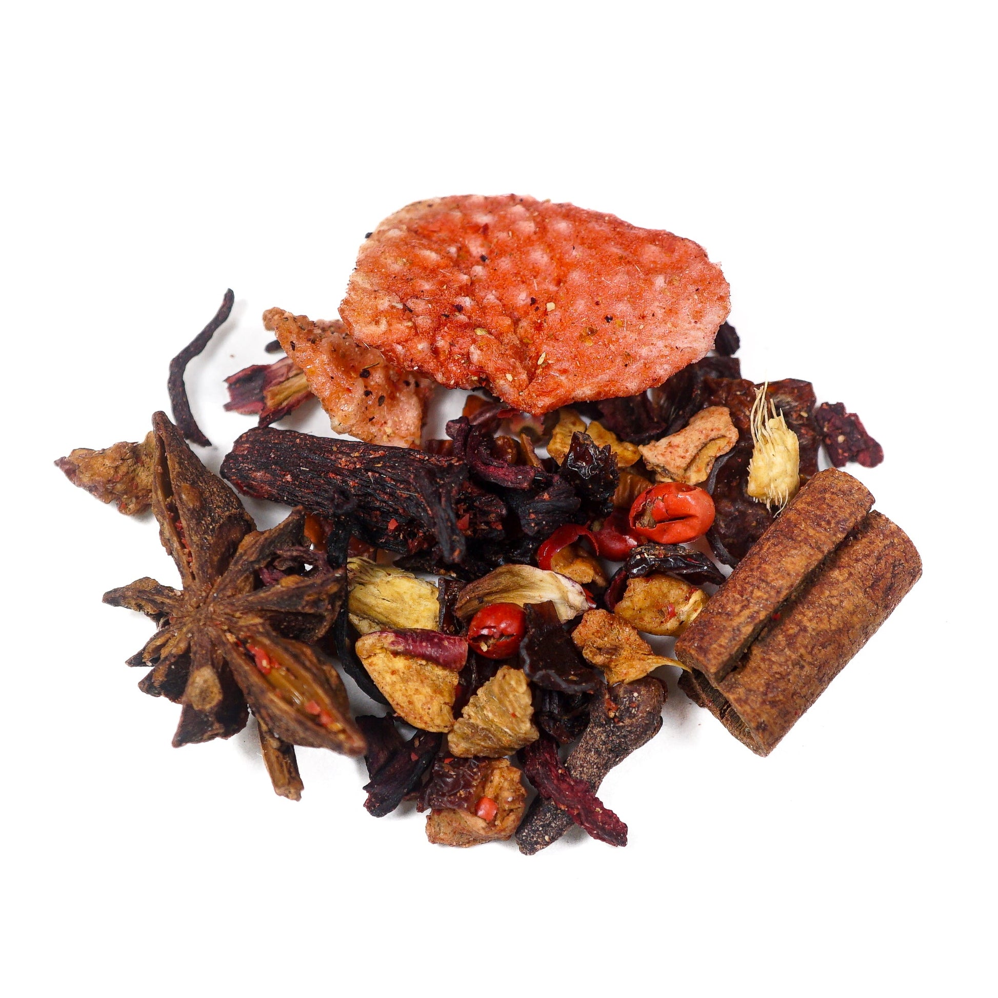 Lielie, sulīgie zemeņu gabaliņi un zvaigžņu anīss piešķir šai tējai vizuālu maģiju, kas jau pirms pirmā malka liek sajust svētku tuvošanos. Garšā atklājas bagātīga, augļaina un maigi pikanta kombinācija, kas atgādina karstvīna aromātu — silta, sildoša un dziļi ziemīga.